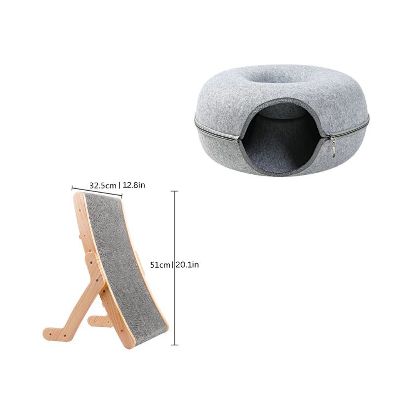 Indulge in the Ultimate Feline Play & Lounge Set—ScratchSlope meets Purr-fect Circle! This match made in cat heaven combines a Solid Wood Framed Cat Scratcher with an ergonomic curve and a soft, donut-shaped hideaway. From exercising to dozing, your cat can now have it all, while you enjoy a seamless blend of style and functionality in your home.