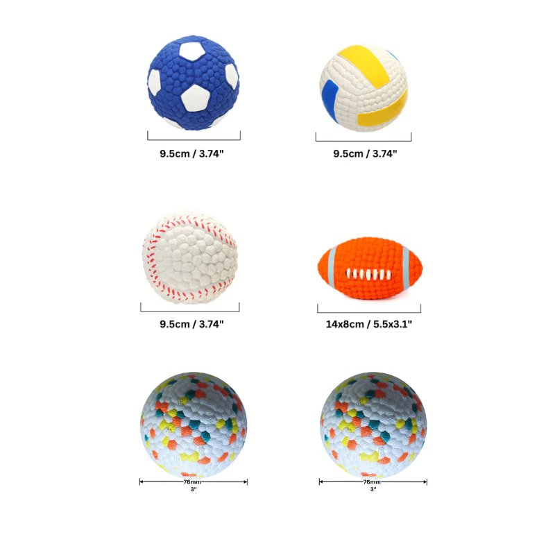 Step up your pet's playtime with a variety that's set to excite and endure. From the sports-themed chewballs to the mighty IndestructiBall, your dog is in for a treat that will withstand even the most passionate chewers. The array of shapes and textures offers a fascinating experience, keeping your dog entertained, physically active, and mentally stimulated. Say goodbye to frequent toy replacements; this bundle is built to last!